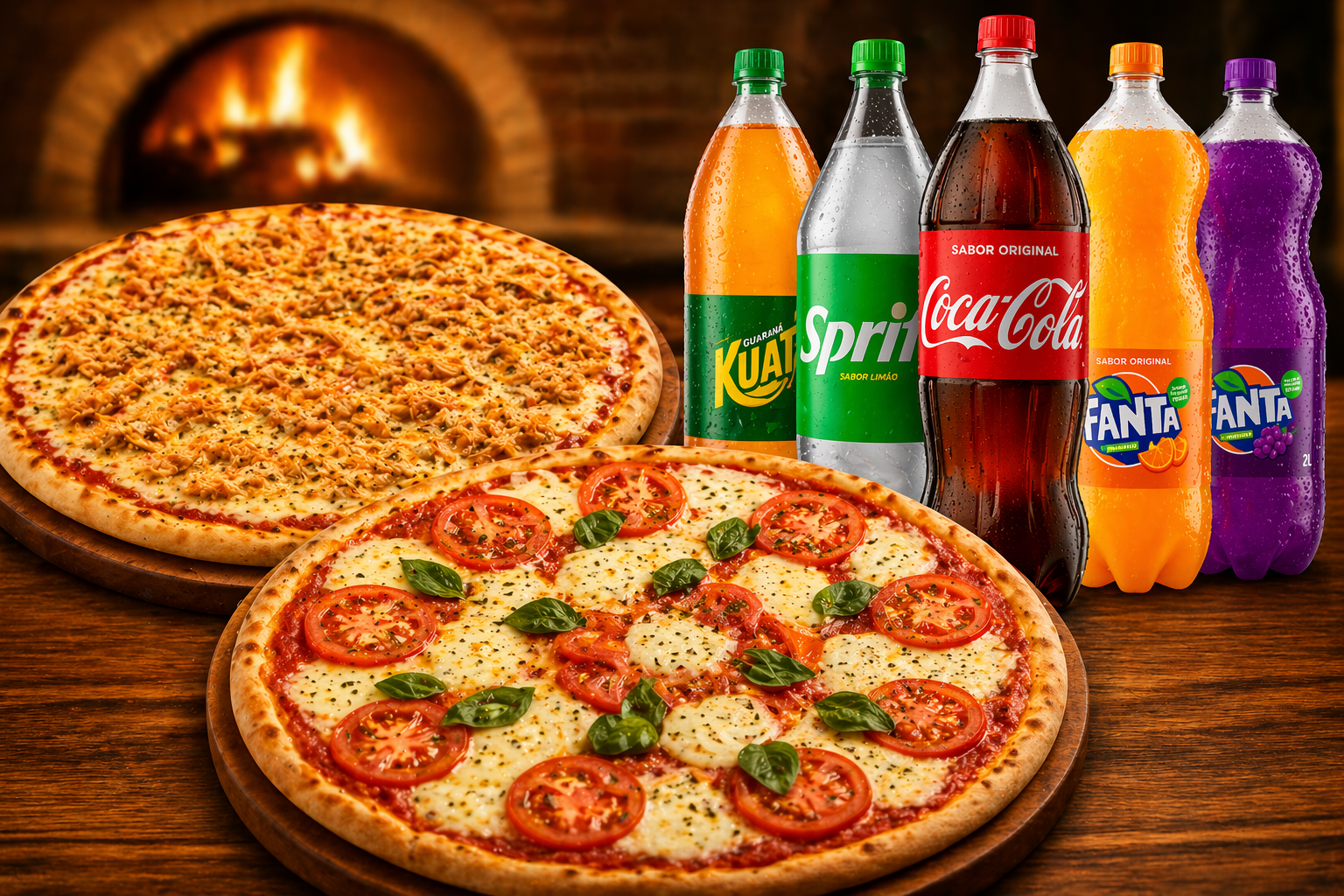 1 Pizza Grande de frango + 1 Pizza Grande Marguerita + 1 Refrigerante 2 Litros 😉 Obs. Somente pizzas disponíveis na lista do combo, não válido para consumo nas mesas!